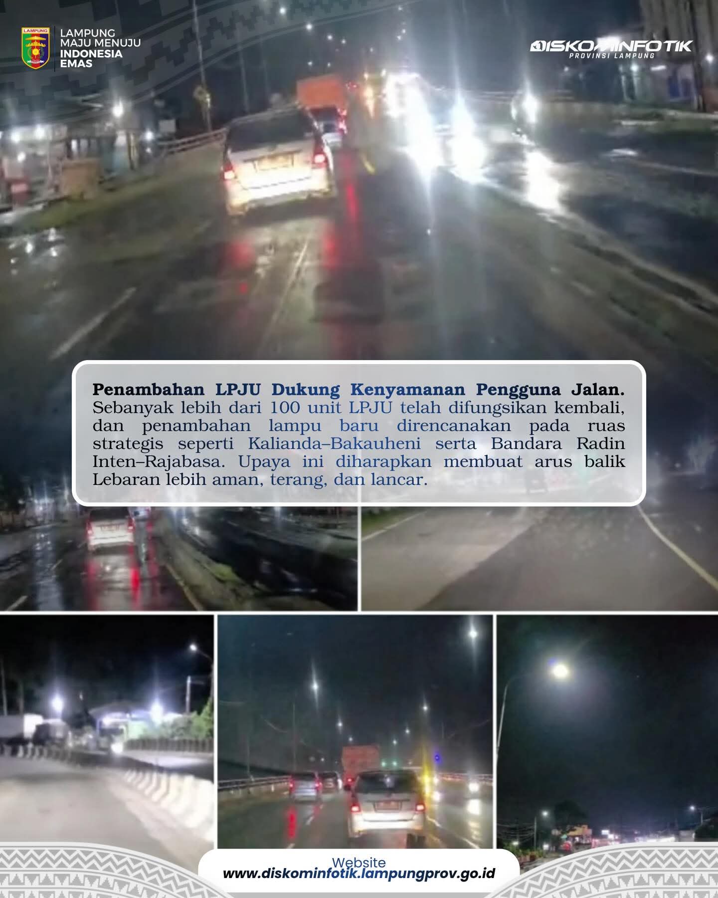 Dinas Perhubungan Kabupaten Lampung Selatan telah memperbaiki 70 titik LPJU serta melakukan perawatan terhadap 30 unit LPJU milik BPTD, sementara BPTD Kemenhub RI menambah perawatan 10 unit LPJU di wilayah Natar dan Kalianda.
