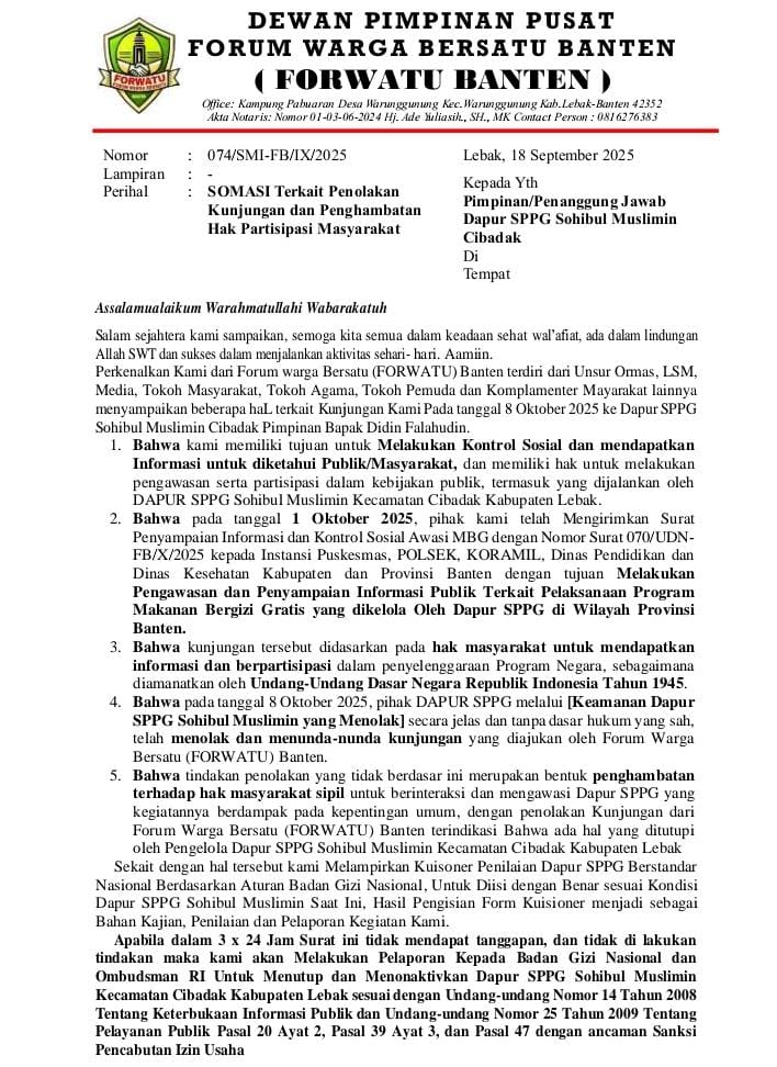 Wartaindonesianews.web.id – Lebak – Surat Somasi bernomor 074/SMI-FB/IX/2025 dilayangkan oleh Forum Warga Bersatu (Forwatu) Banten, sebagai tindak lanjut dari hasil investigasi yang dilakukan oleh Tim Khusus Awasi MBG Forwatu Banten.