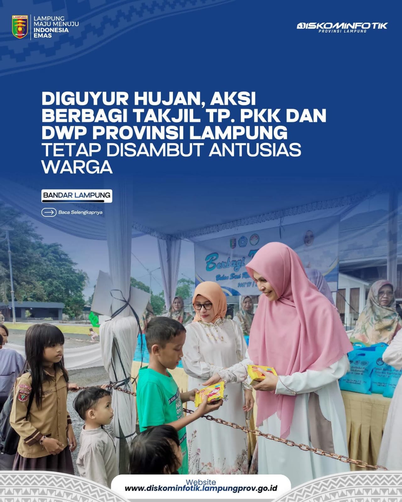 Sebanyak 300 paket takjil yang terdiri dari makanan berat, makanan ringan, dan aneka snack dibagikan kepada masyarakat. Kegiatan ini turut melibatkan Biro Hukum, Dinas Ketahanan Pangan, Tanaman Pangan dan Hortikultura, serta Dinas Pariwisata Provinsi Lampung.