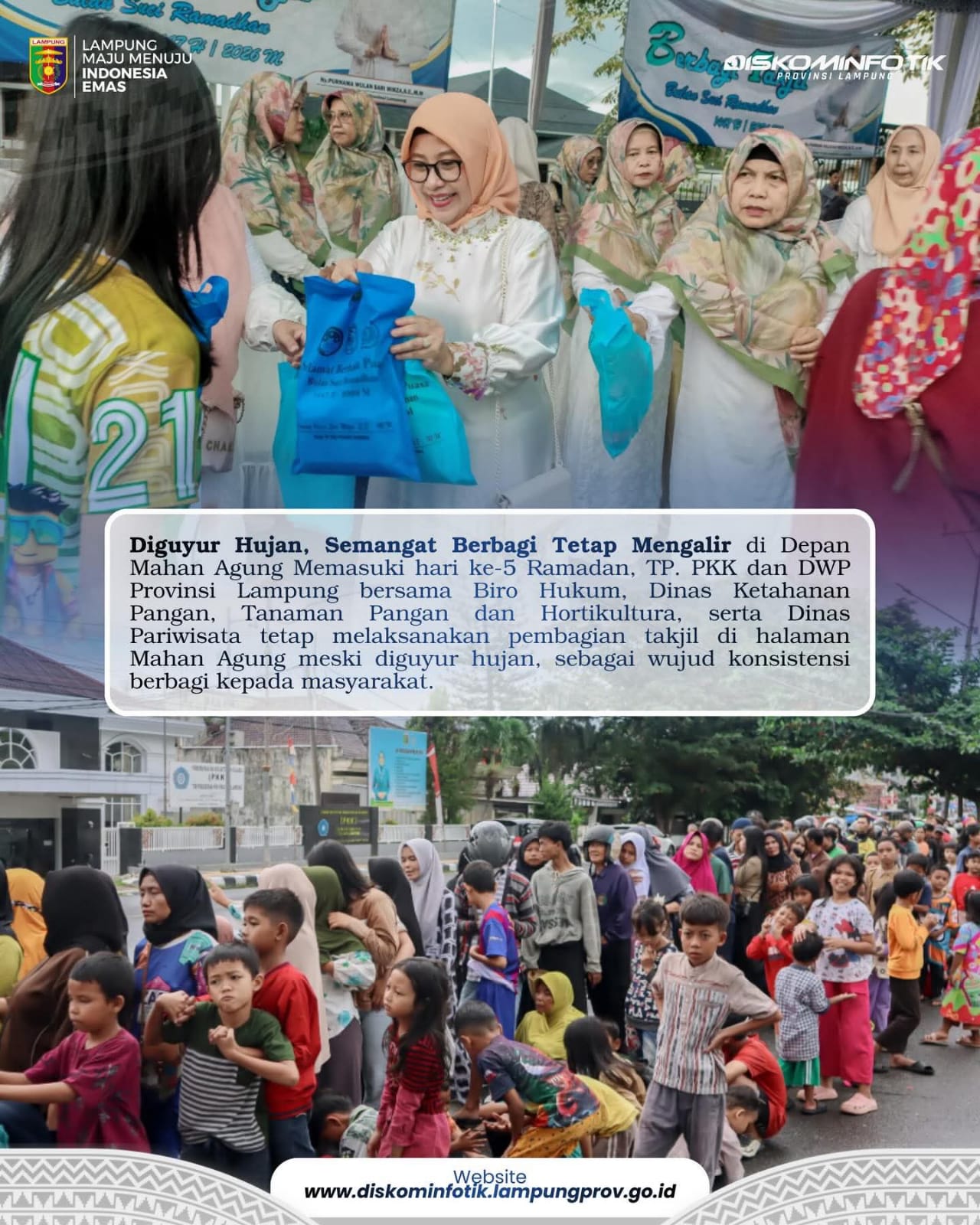 Melalui kegiatan ini, TP. PKK dan DWP Provinsi Lampung berharap semangat kepedulian dan kebersamaan terus terjaga sepanjang bulan suci Ramadan.(adv)