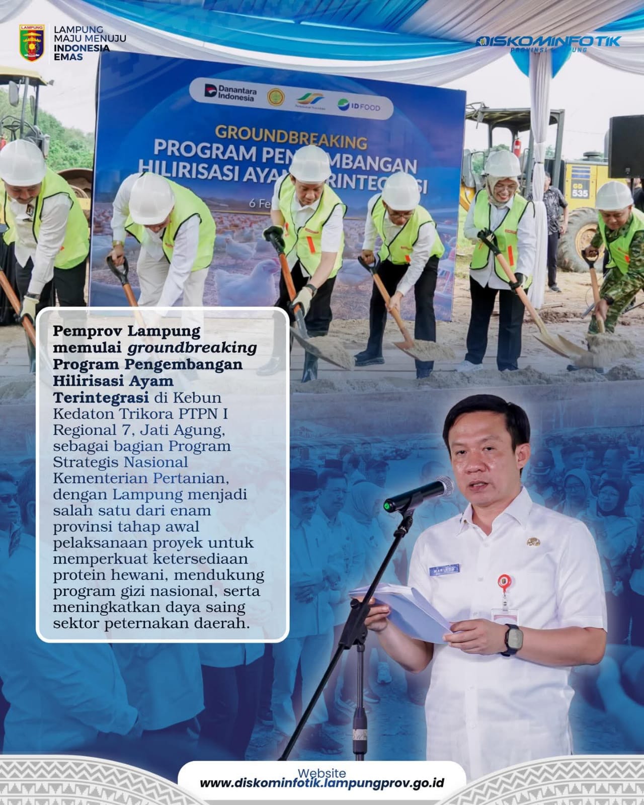 Warta IndonesiaNews | Bandar Lampung |Pemprov Lampung memulai groundbreaking Program Pengembangan Hilirisasi Ayam Terintegrasi di Jati Agung, Lampung Selatan, sebagai bagian dari Program Strategis Nasional Kementerian Pertanian yang digelar pada Jumat (6/2/2026).