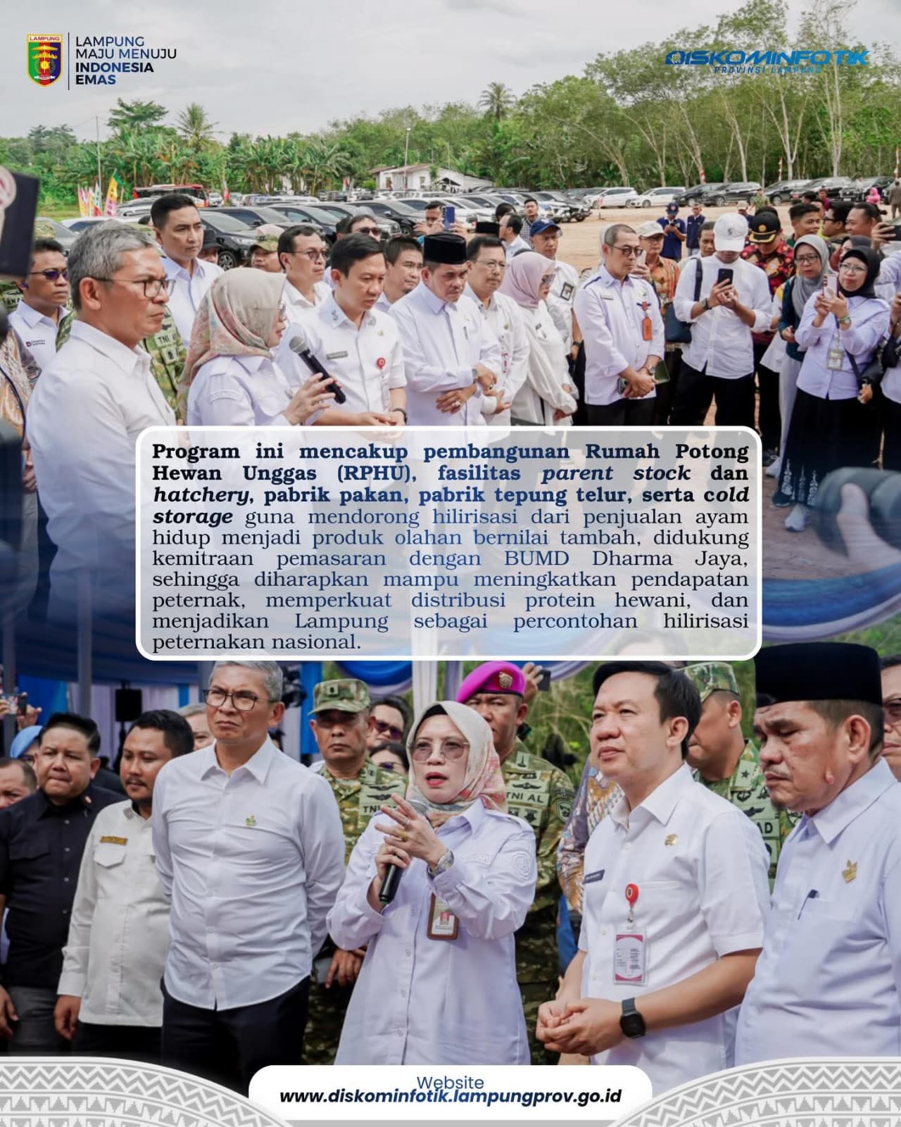 Melalui pembangunan RPHU, hatchery, pabrik pakan, pabrik tepung telur, dan cold storage, program ini mendorong peralihan dari penjualan ayam hidup menjadi produk olahan bernilai tambah guna meningkatkan pendapatan peternak, memperkuat pasokan protein hewani, serta menjadikan Lampung sebagai percontohan hilirisasi peternakan nasional. ( Adv)