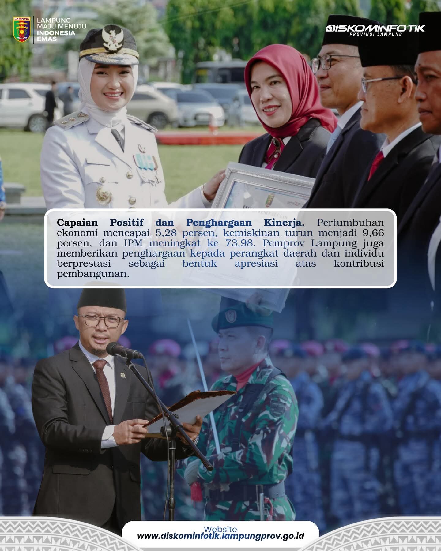 Pada kesempatan tersebut, Pemprov Lampung juga memberikan berbagai penghargaan, antara lain kepada perangkat daerah atas evaluasi SAKIP dan digitalisasi kinerja, penilaian kematangan perangkat daerah, serta penghargaan pelayanan publik dari Ombudsman RI.