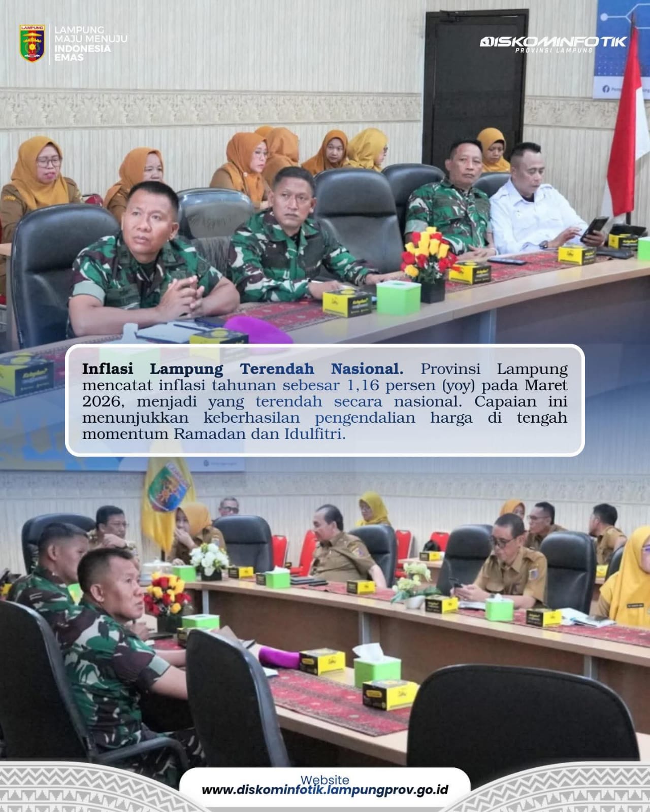Warta Indonesia News| Bandar Lampung – Pemerintah Provinsi Lampung terus memperkuat pengendalian inflasi di tengah dinamika harga selama Ramadan dan Idulfitri 2026. Hasilnya, inflasi Lampung tercatat sebagai yang terendah secara nasional dengan angka 1,16 persen (year-on-year) pada Maret 2026 serta masuk 10 besar inflasi terendah secara bulanan (month-to-month) sebesar 0,15 persen.