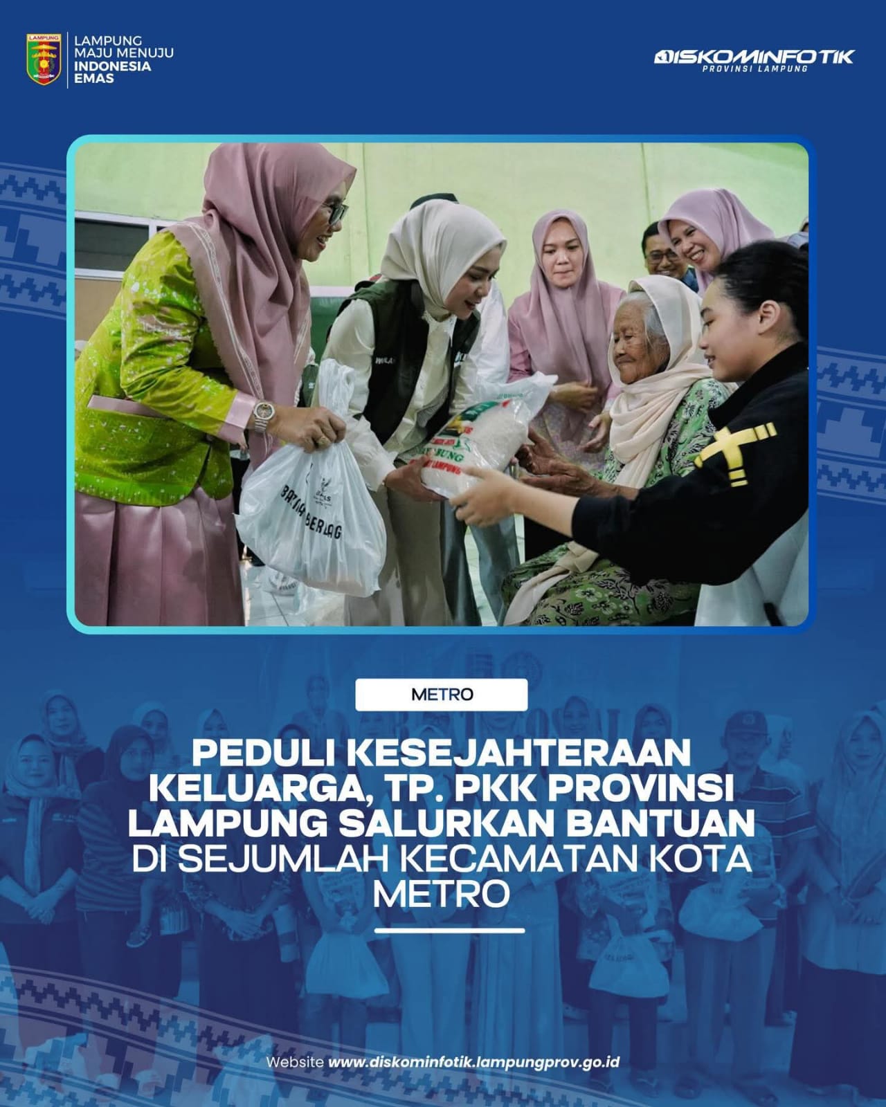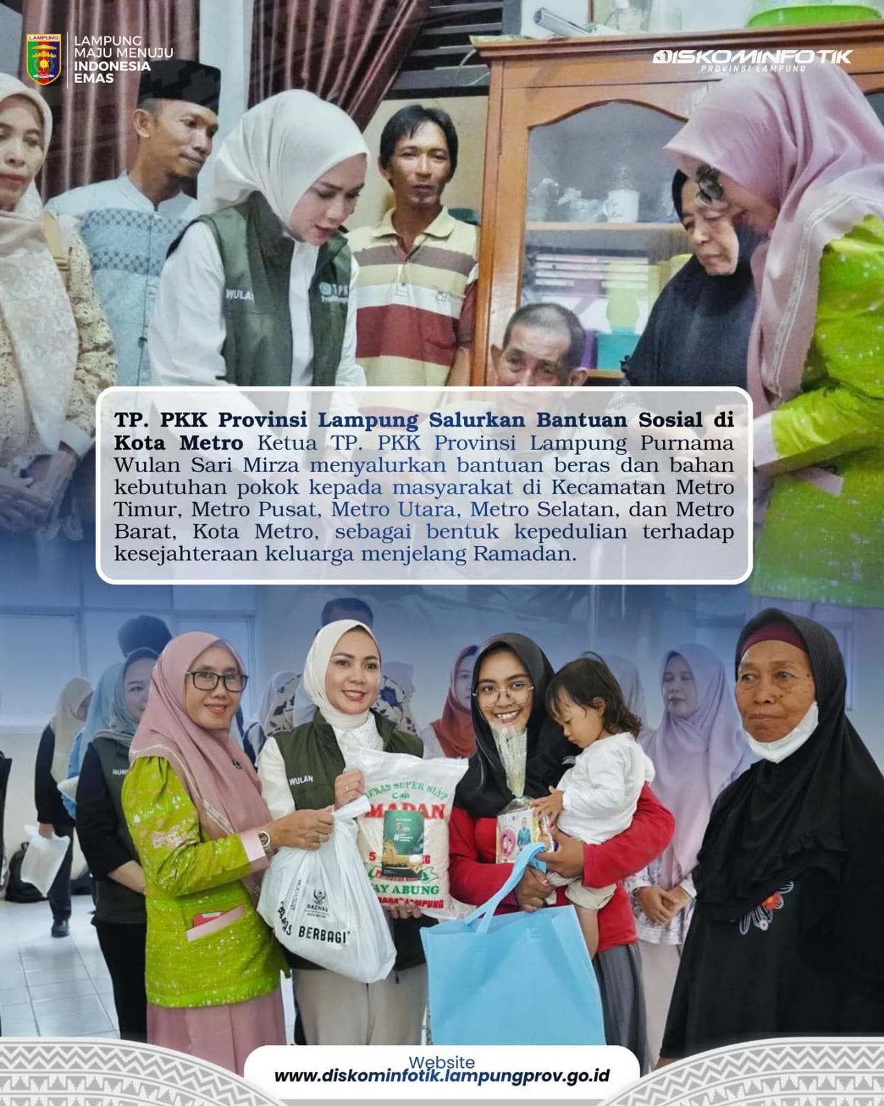 Berkolaborasi dengan Baznas Provinsi Lampung dan didampingi Ketua TP. PKK Kota Metro, bantuan berupa beras dan bahan kebutuhan pokok diserahkan kepada puluhan penerima manfaat di Metro Timur, Metro Pusat, Metro Utara, Metro Selatan, dan Metro Barat.