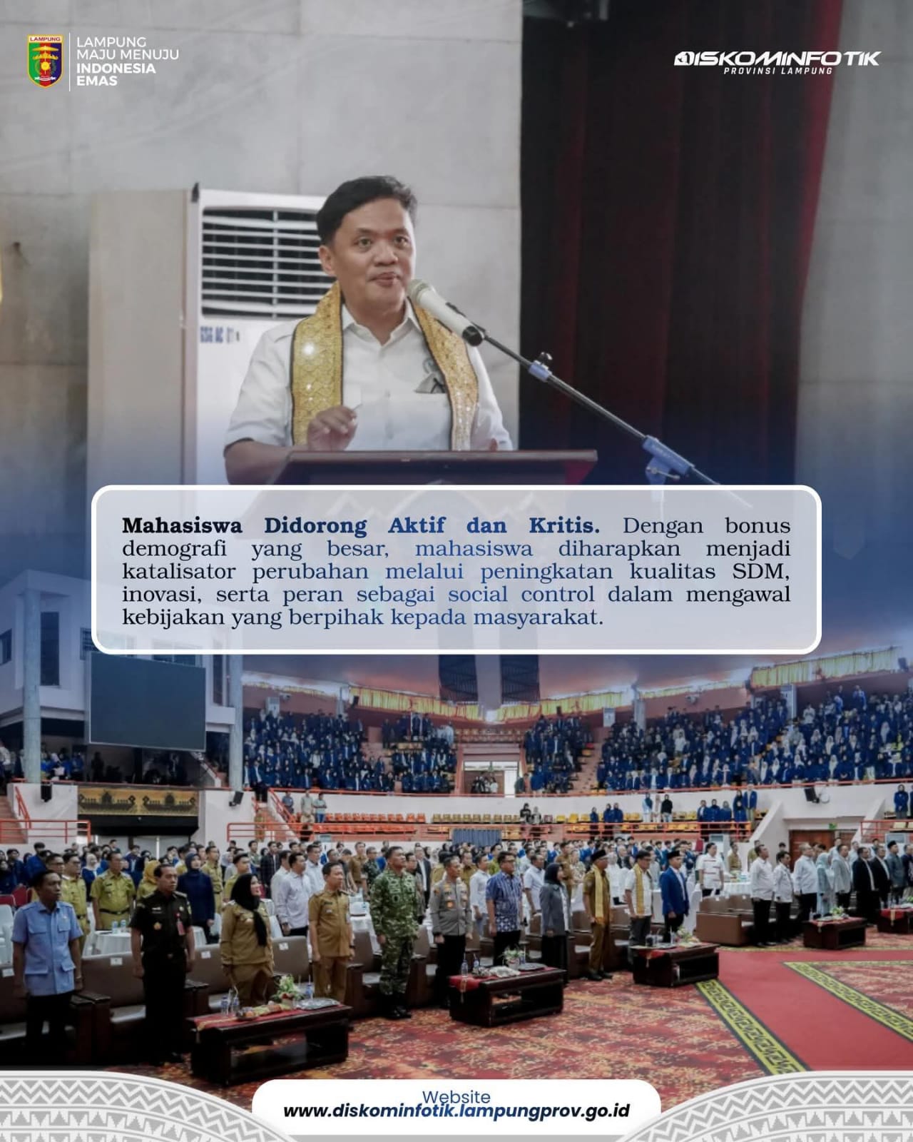 Provinsi Lampung saat ini berada pada fase bonus demografi dengan sekitar 71 persen penduduk usia produktif, sehingga mahasiswa memiliki peran penting sebagai motor penggerak perubahan dan inovasi menuju Indonesia Emas 2045.