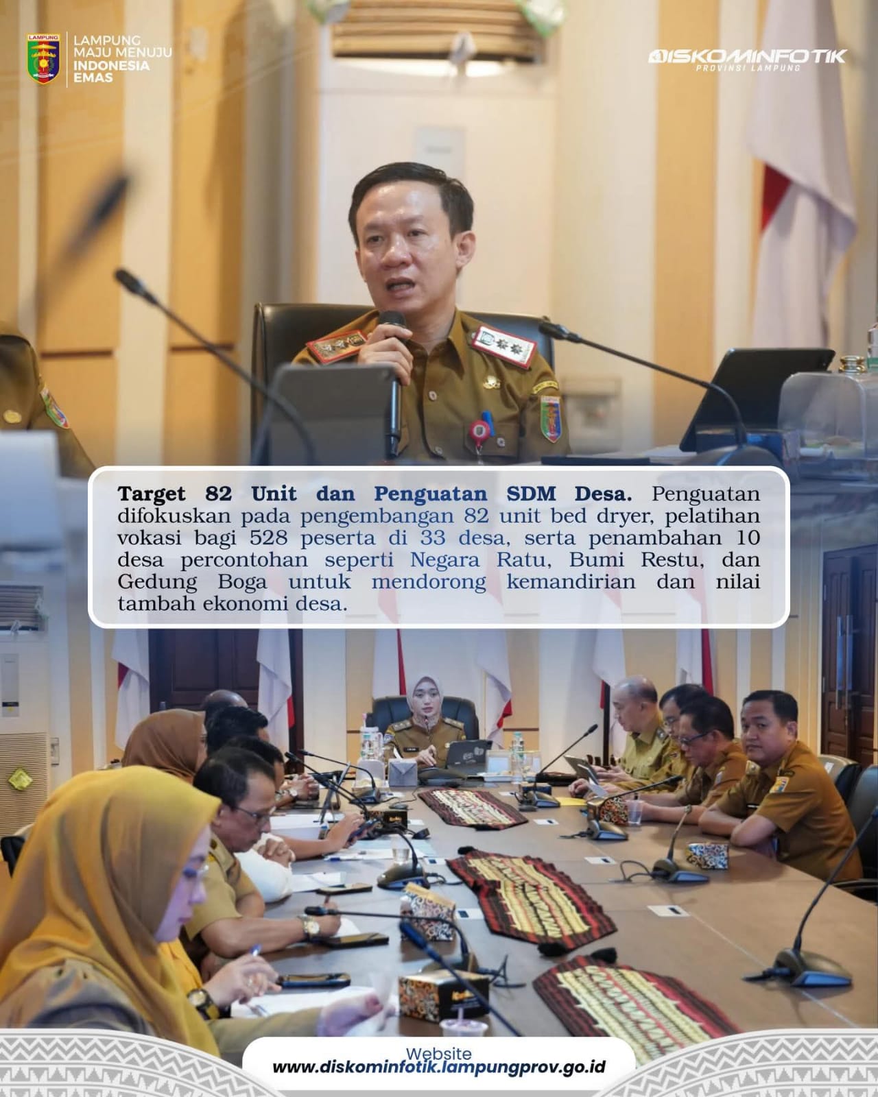 Selain itu, Pemprov Lampung juga menyiapkan 10 desa percontohan, di antaranya Desa Negara Ratu, Bumi Restu, dan Gedung Boga, sebagai model pengembangan ekonomi desa berbasis potensi lokal.