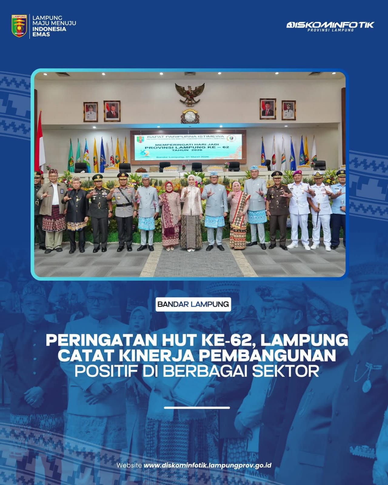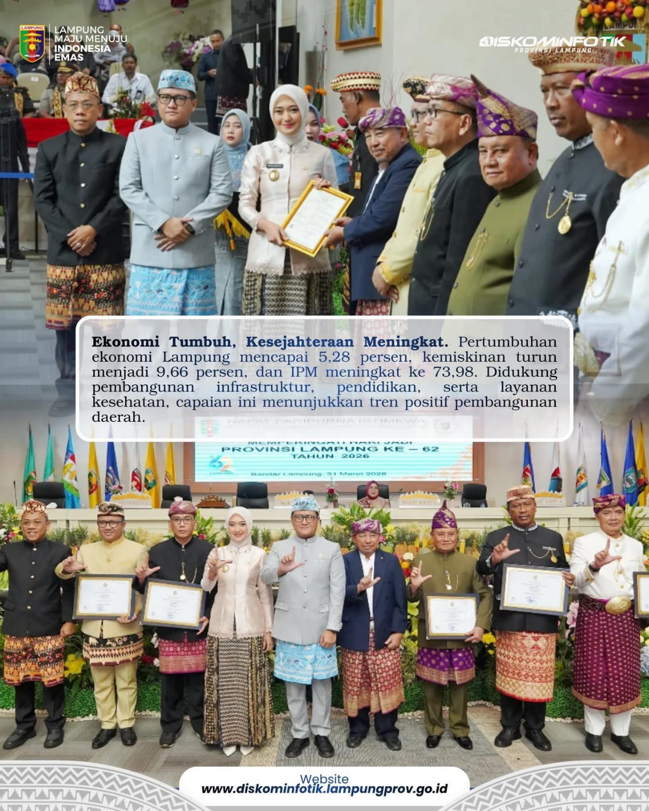 Pertumbuhan ekonomi Lampung pada tahun 2025 mencapai 5,28 persen, tingkat kemiskinan berhasil ditekan menjadi 9,66 persen, serta Indeks Pembangunan Manusia meningkat menjadi 73,98 dan masuk kategori tinggi.