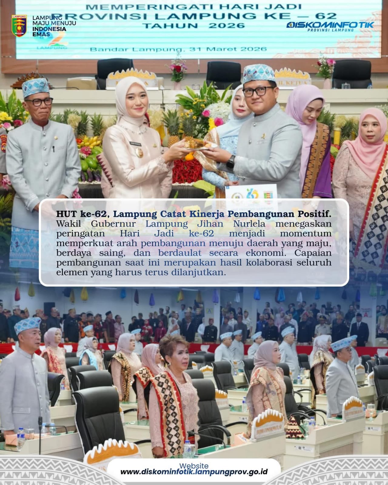 WartaIndonesiaNews – Bandar Lampung – Wakil Gubernur Lampung Jihan Nurlela menegaskan bahwa peringatan Hari Jadi ke-62 Provinsi Lampung menjadi momentum untuk memperkuat arah pembangunan menuju daerah yang maju, berdaya saing, dan berdaulat secara ekonomi.