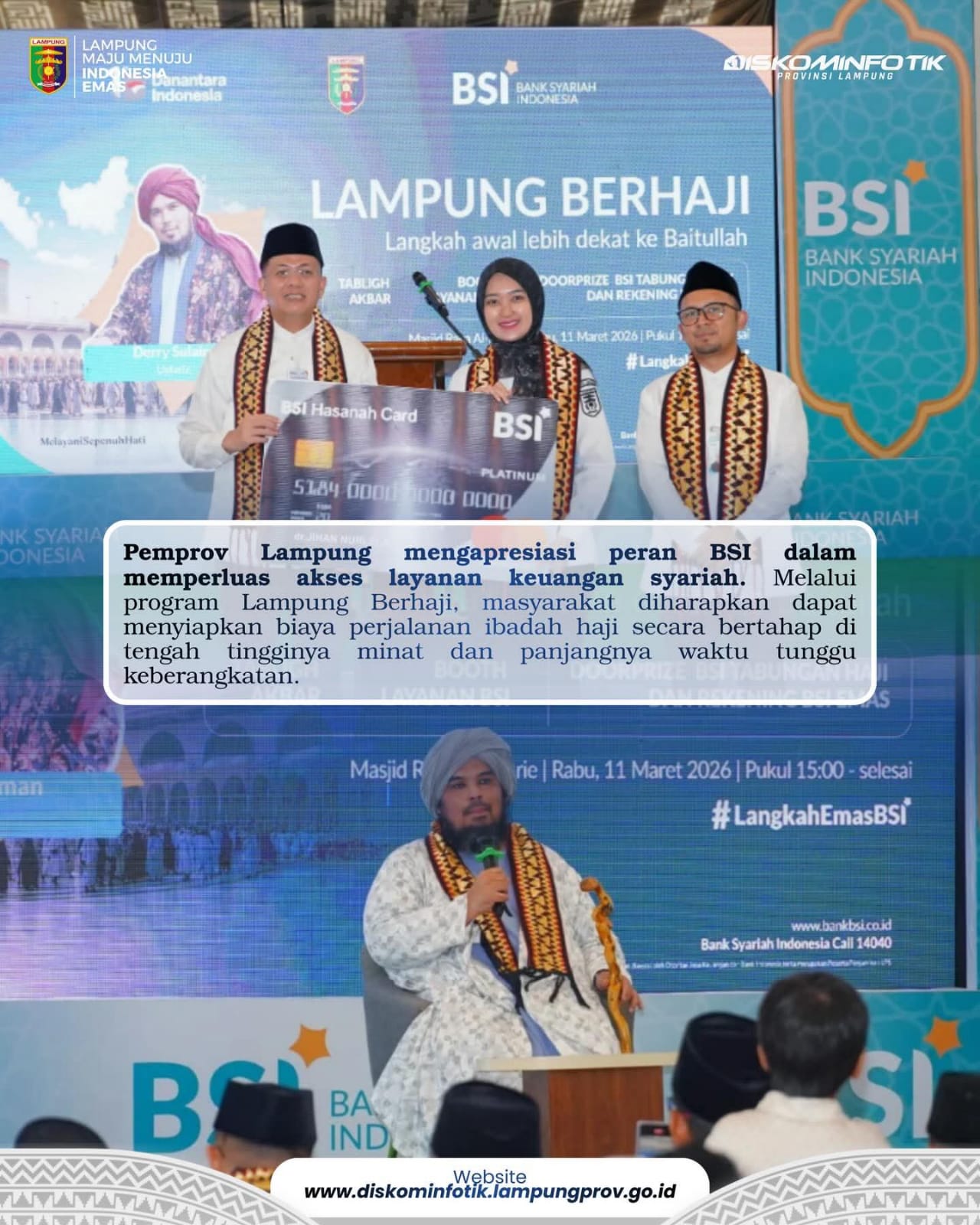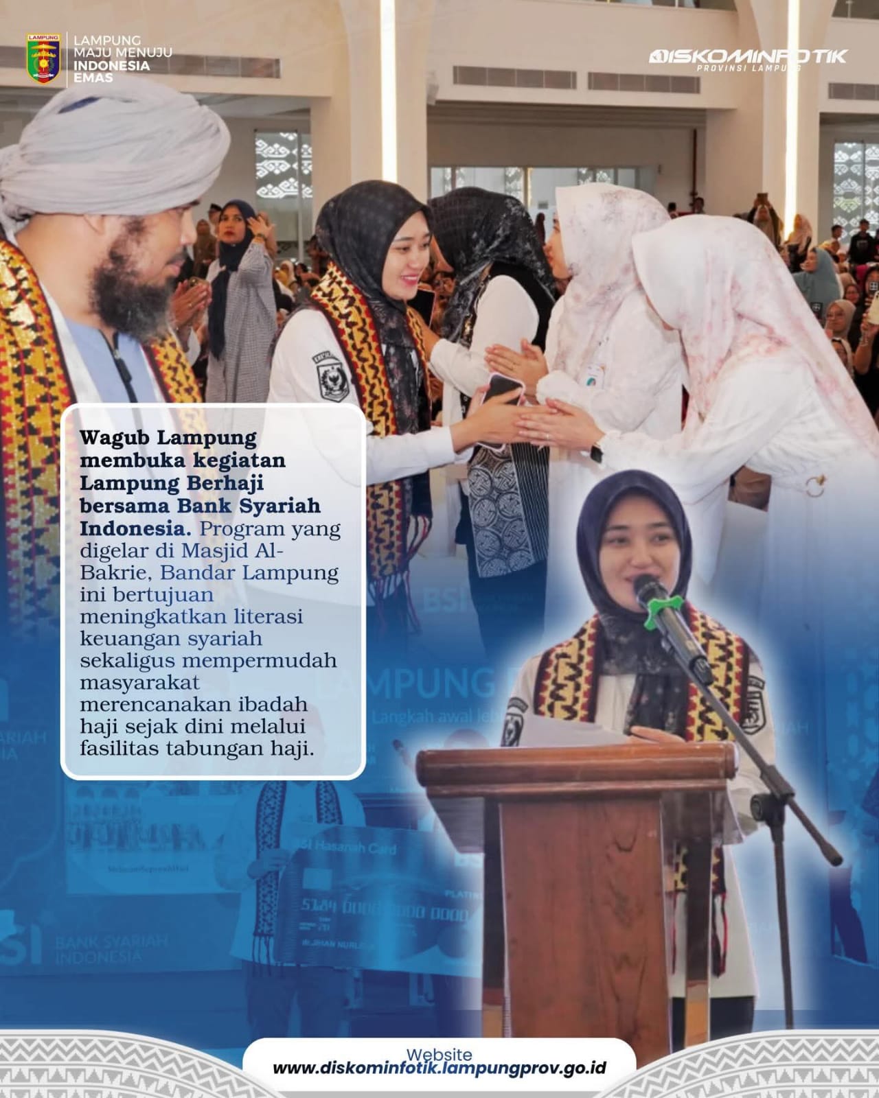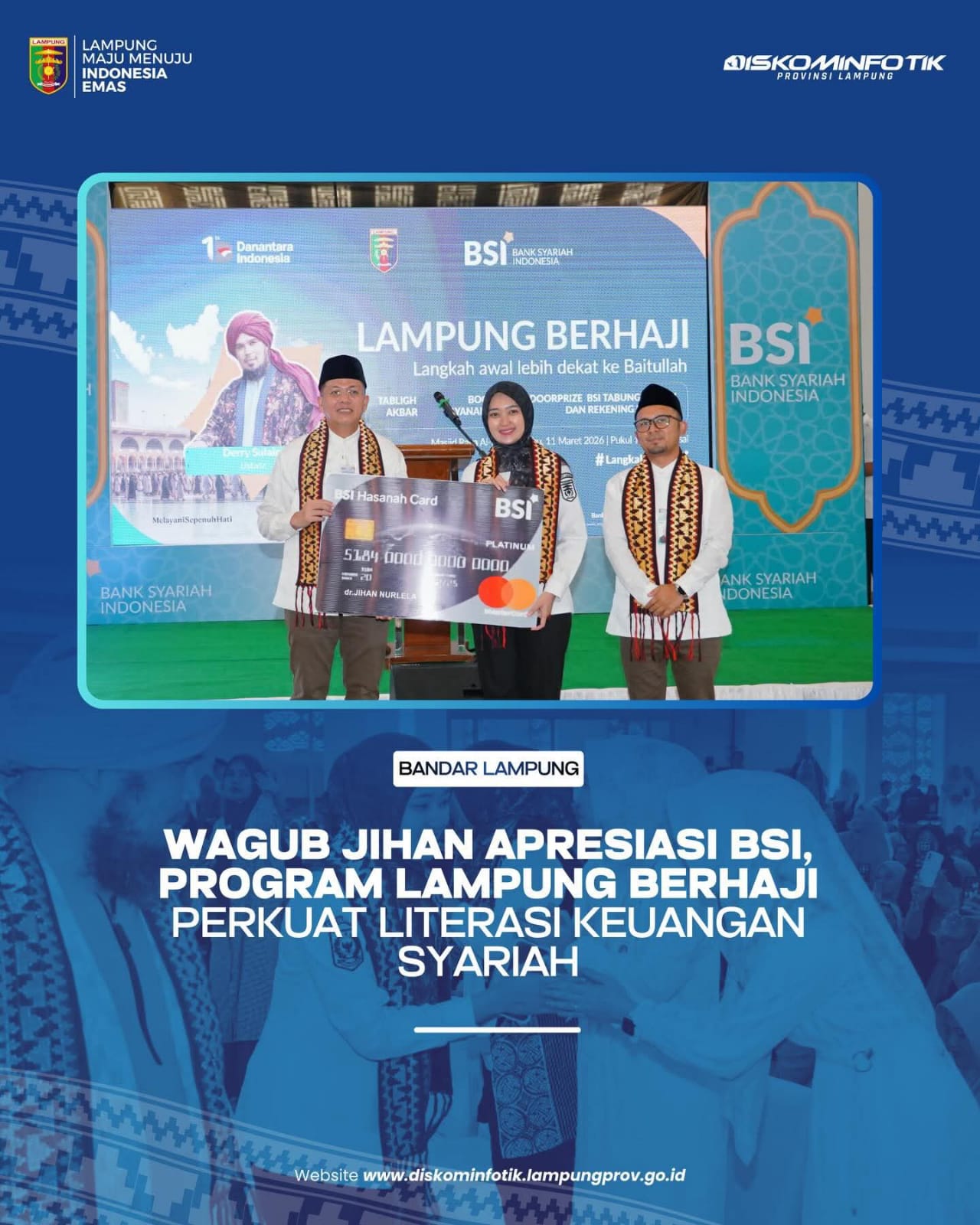 Warta Indonesia News | Bandar Lampung – Wakil Gubernur Lampung Jihan Nurlela membuka kegiatan Lampung Berhaji yang diselenggarakan Bank Syariah Indonesia (BSI) bekerja sama dengan Pemerintah Provinsi Lampung di Masjid Al-Bakrie, Bandar Lampung, Rabu (11/3/2026).