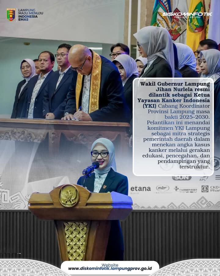 Warta IndonesiaNews | Bandar Lampung | Wakil Gubernur Lampung Jihan Nurlela resmi dilantik sebagai Ketua Yayasan Kanker Indonesia (YKI) Cabang Koordinator Provinsi Lampung masa bakti 2025–2030.