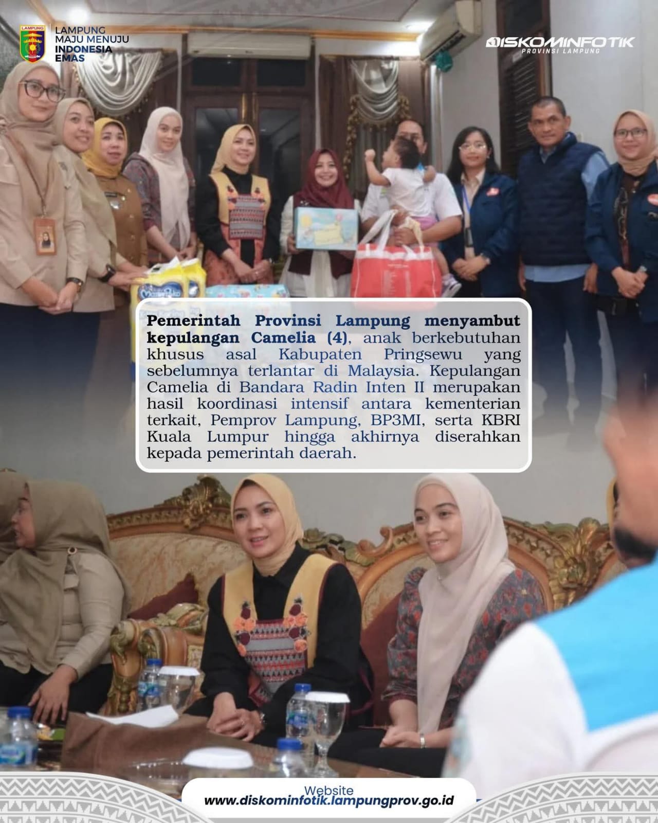 Warta IndonesiaNews | Bandar Lampung | Pemerintah Provinsi Lampung menyambut kepulangan Camelia (4), anak berkebutuhan khusus asal Kabupaten Pringsewu yang sebelumnya terlantar di Malaysia.