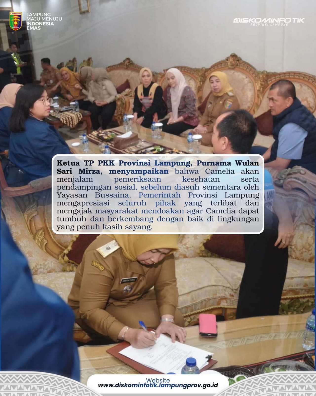 Setibanya di Lampung, Camelia akan menjalani pemeriksaan kesehatan serta pendampingan sosial dan mendapat pengasuhan sementara di Yayasan Bussaina.